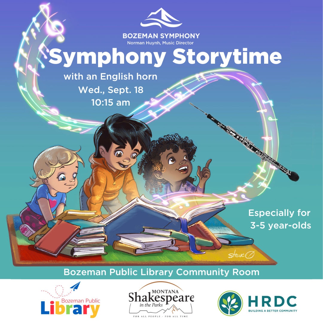 This free program will feature Bozeman Symphony’s talented English Horn player, Mateo Mendez, who will accompany Montana Shakespeare in the Parks Associate Artistic Director Riley O’Toole as they bring a beloved storybook to life. Following the story, Mendez will perform a short piece showcasing the unique sounds of the English Horn, offering children a delightful introduction to the instrument. Later that day, students at Bozeman HRDC Head Start will also enjoy this enriching experience.